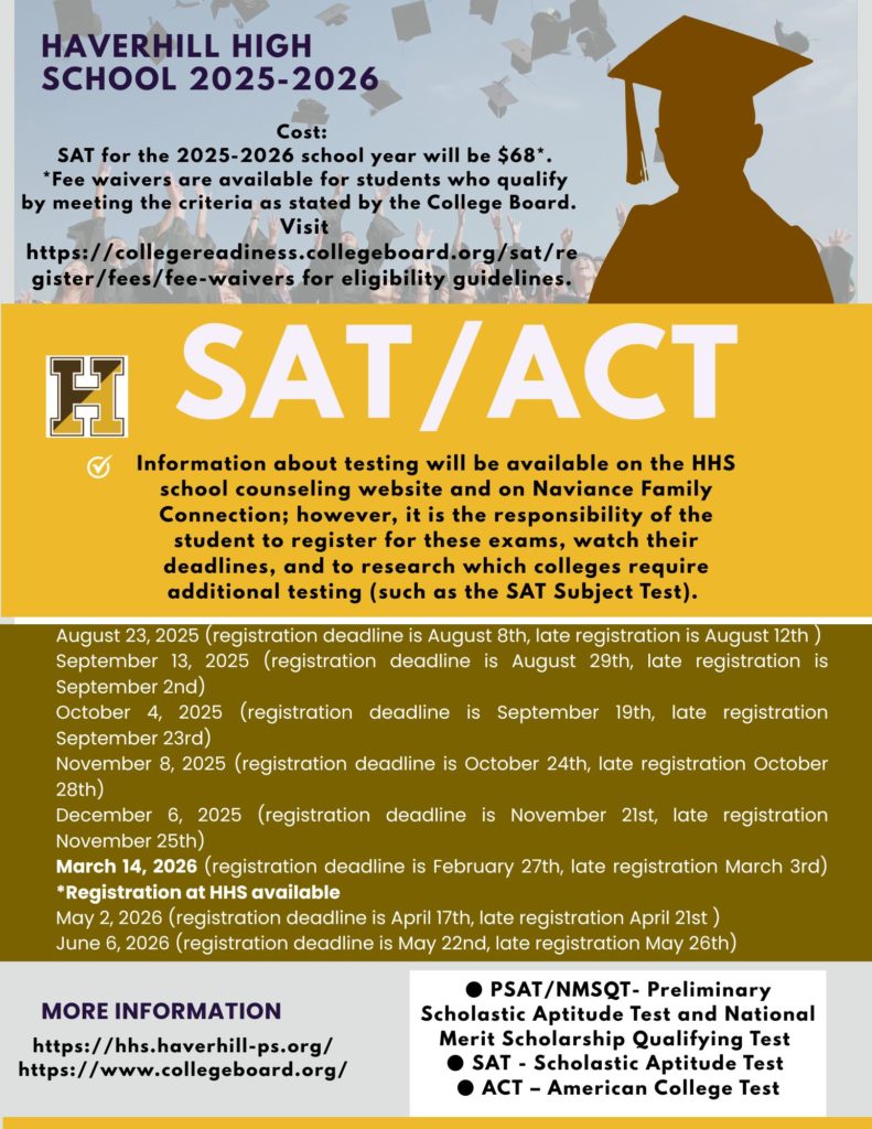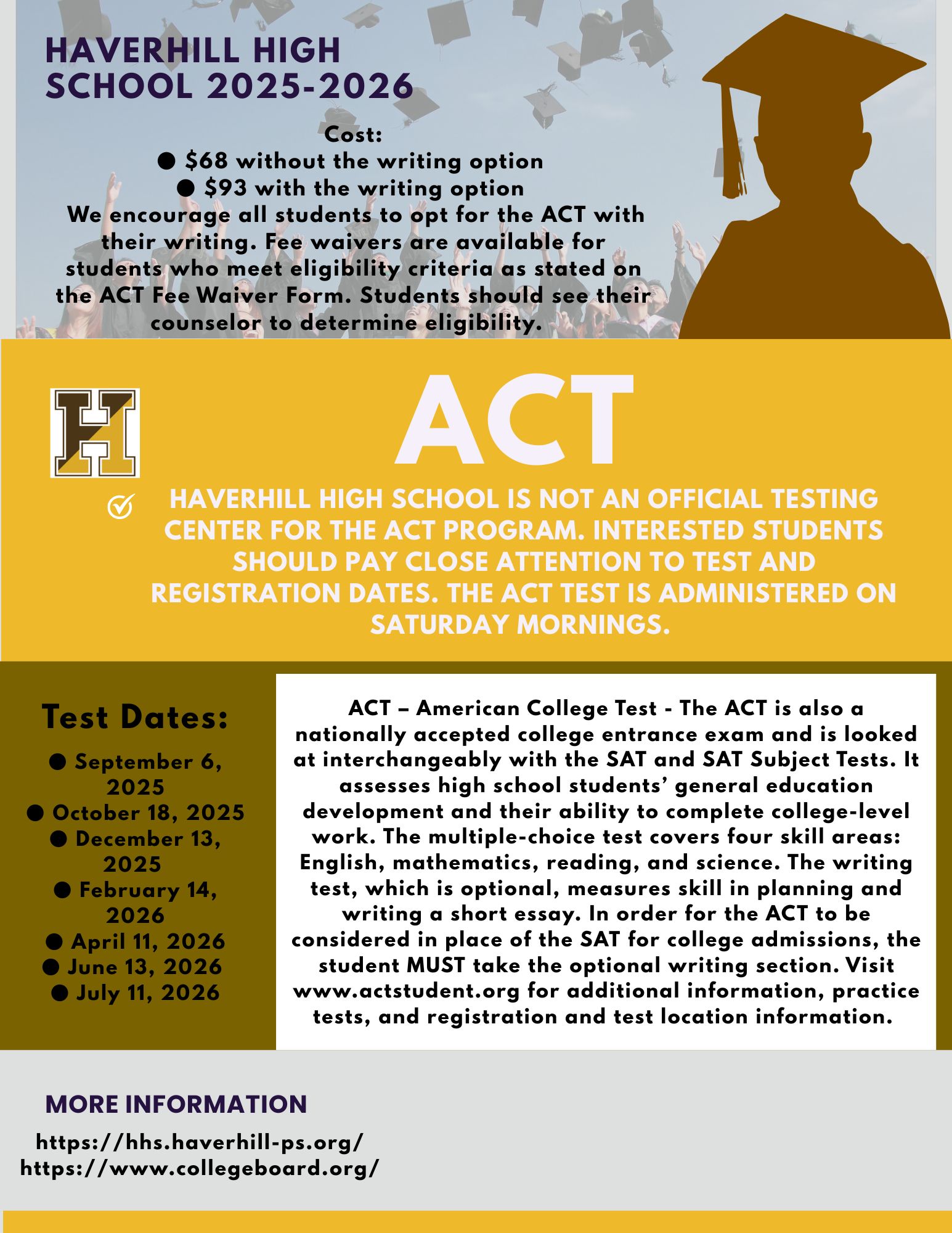 Haverhill High School will be hosting an SATs throughout 2025-2026. Students are expected to arrive at 7:30am and sit for 2 hours for the exam. Students are released at approximately 11am. Students are expected to bring their fully charged chromebooks (since all HPS devices already have Bluebook installed), their testing ticket (print or photo) and one form of identification. Students who are interested should sign into their college board account to register. Students who do not have an account can create one on collegeboard.org. Use this link to register: https://satsuite.collegeboard.org/sat/dates-deadlines