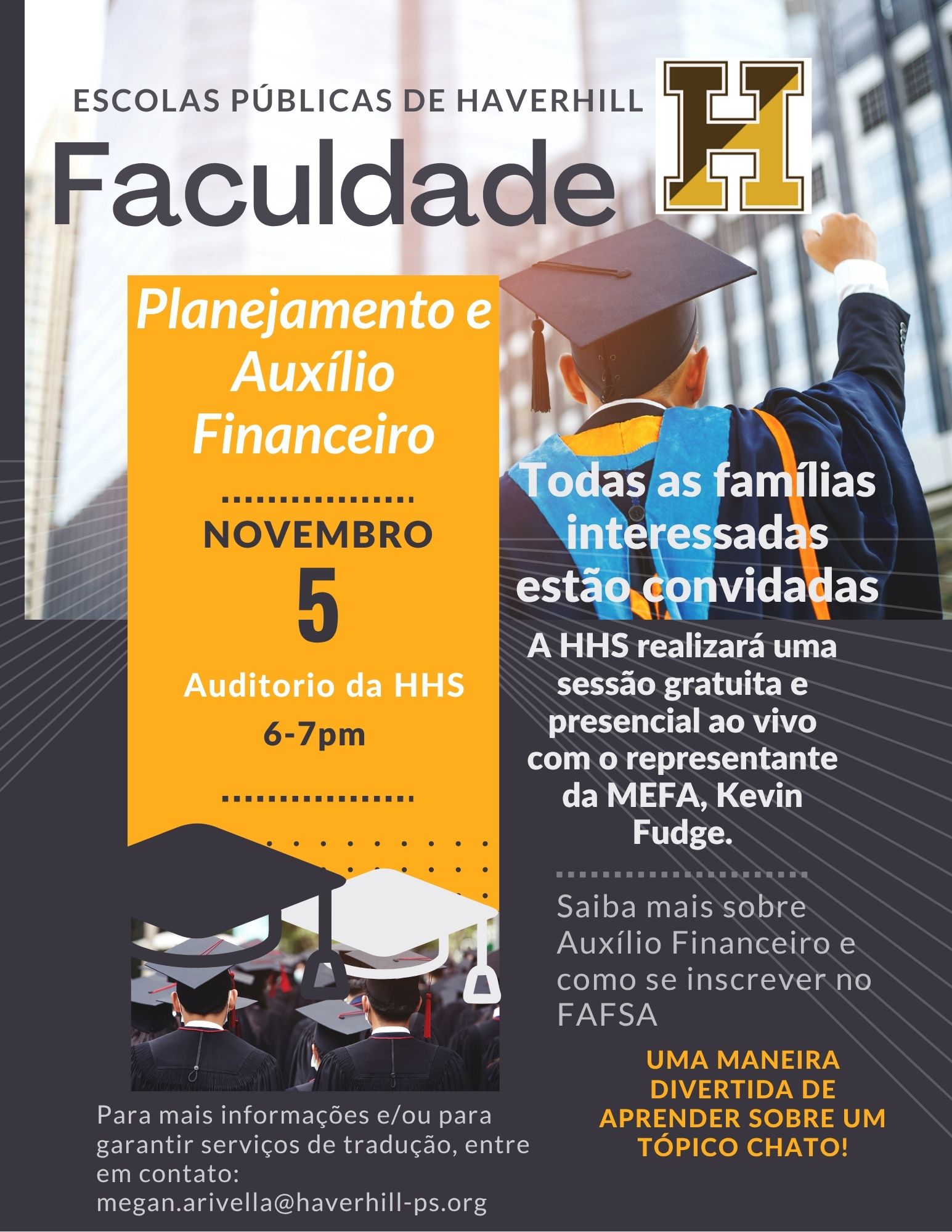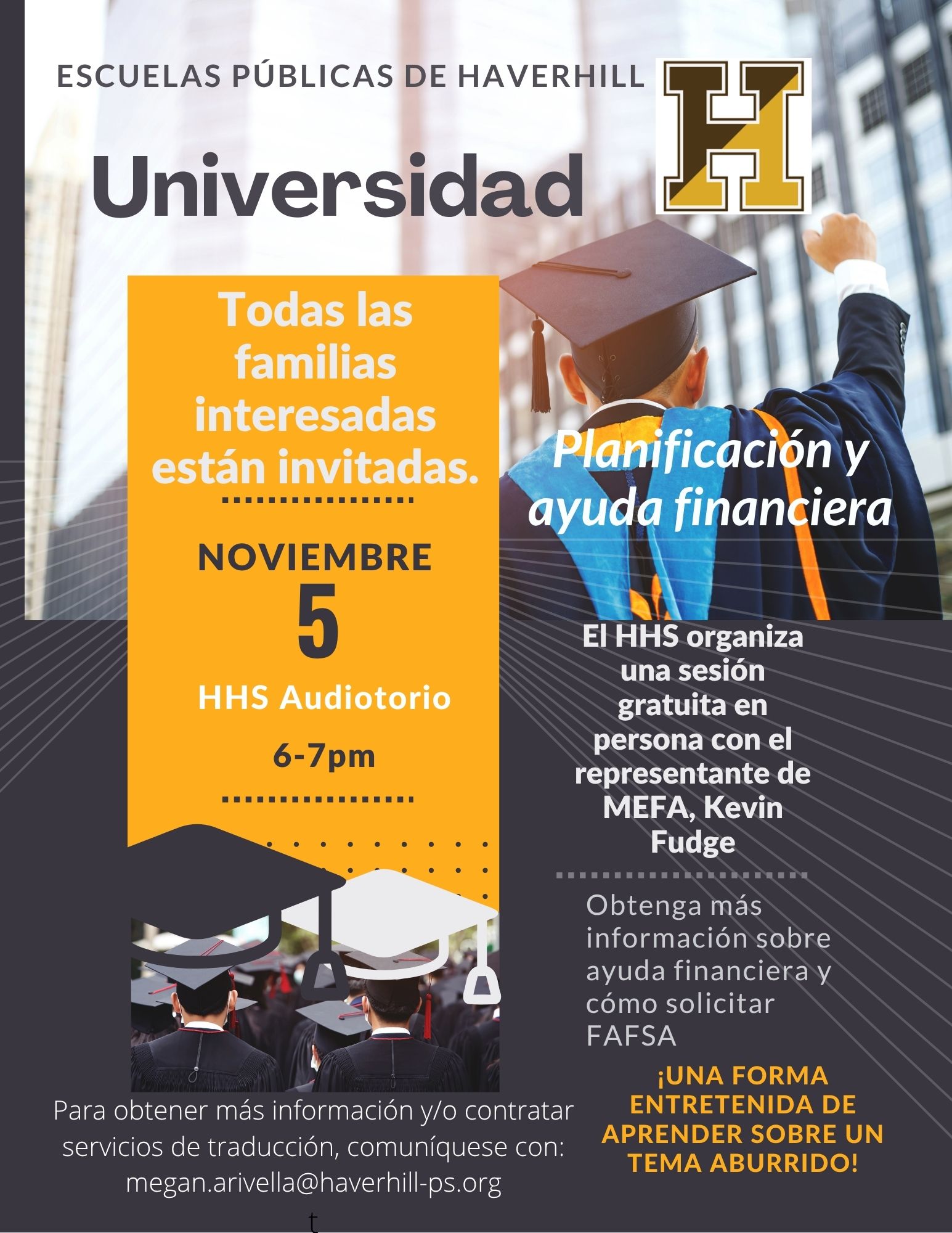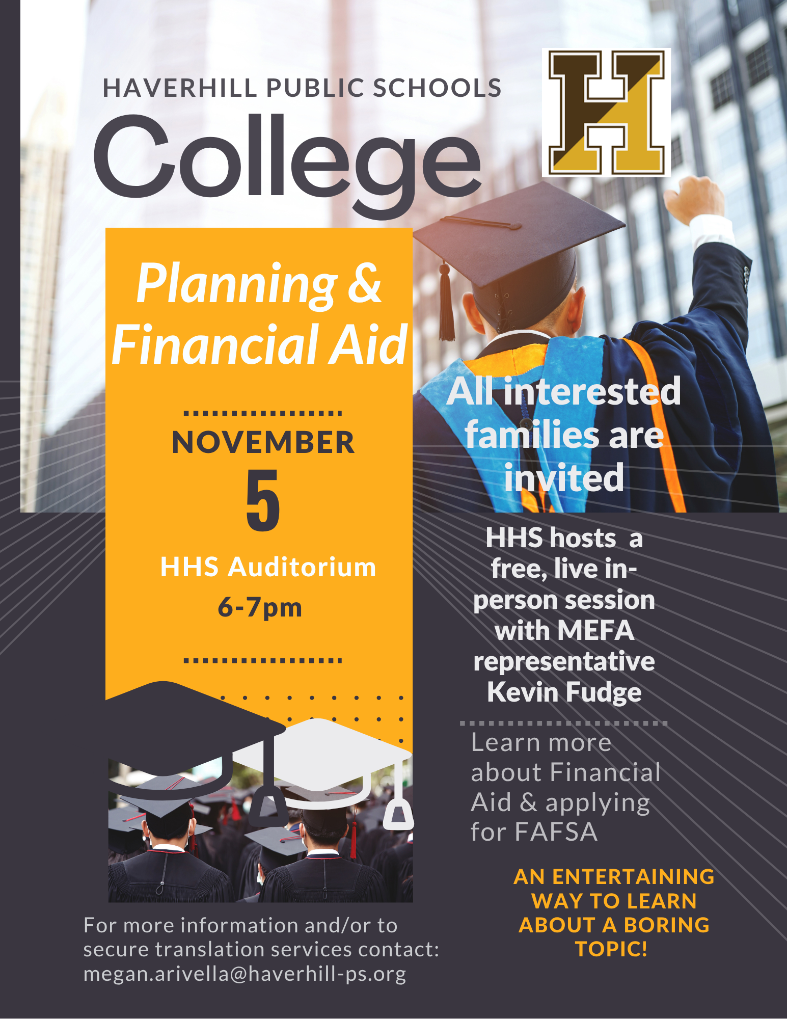 Calling Junior & Senior Parents/Guardians: Although necessary, Information on financial aid can be dull. Join us for a fun night of finances! One hour devoted to learning the ins and outs of managing how to pay for college: November 5th from 6-7pm in the HHS Auditorium. Our School Counseling Department at HHS put a spin on it this year and hosted Kevin Fudge, an MEFA representative. He is an entertaining presenter and provides the ins and outs of FAFSA (Free Application for Federal Student Aid).