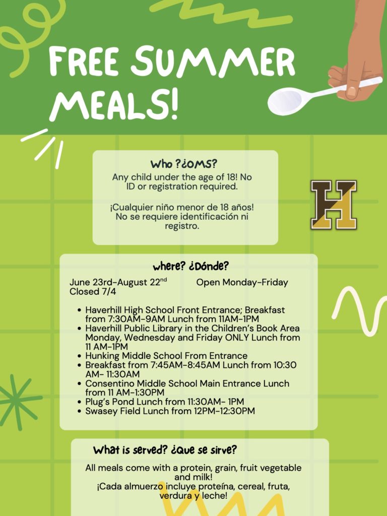 - Haverhill High School Front Entrance – Breakfast from 7:30 AM-9 AM Lunch from 11 AM-1 PM