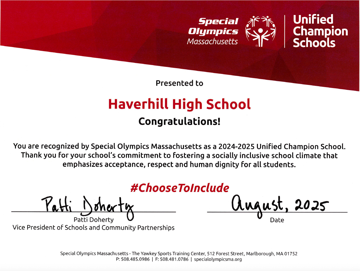 We are incredibly proud to announce that Haverhill High School has been officially named a Special Olympics Massachusetts Unified Champion School!