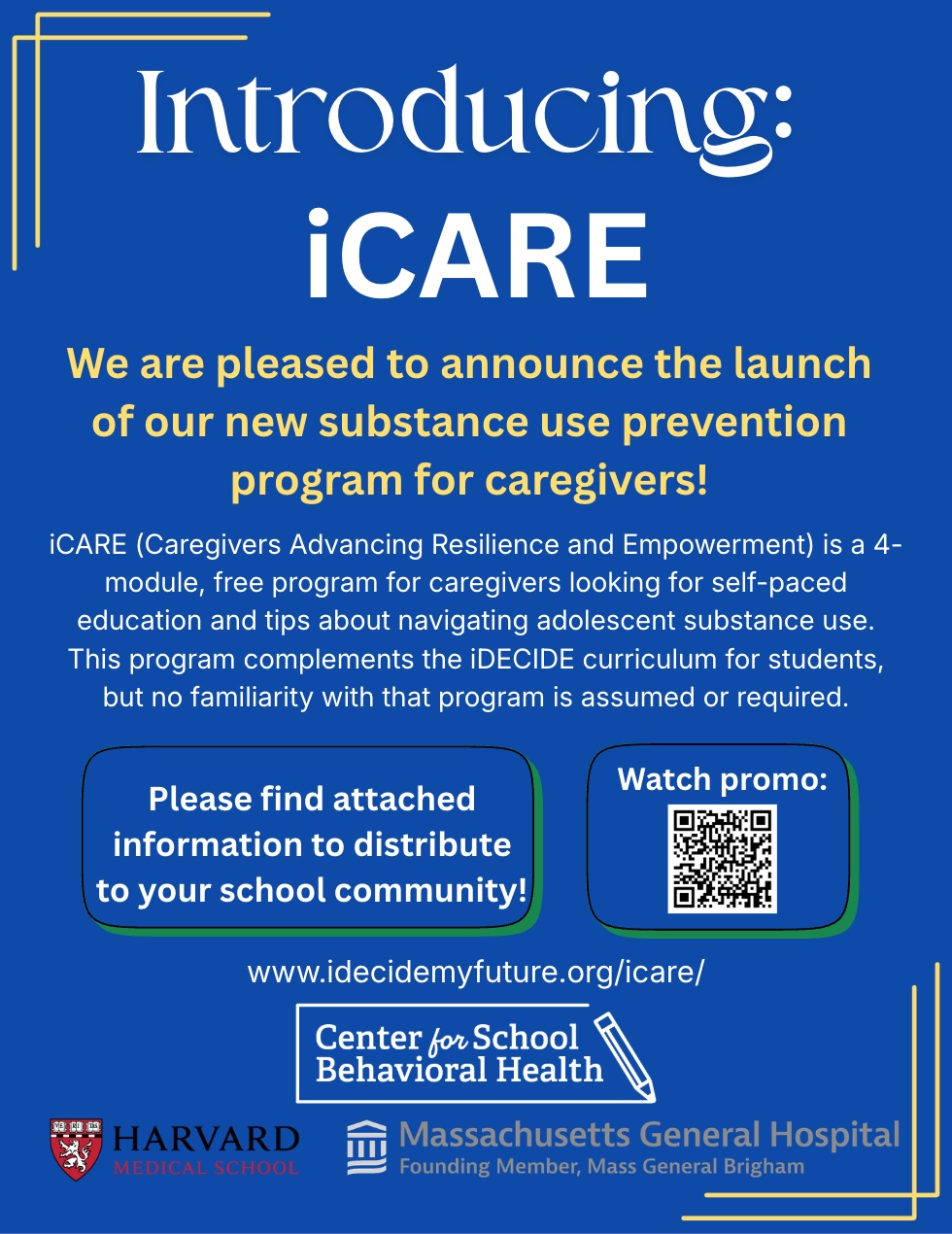 The iCARE program, from the creators of iDECIDE, is a comprehensive curriculum for parents and caregivers focused on understanding substance use and building resilience in children. It covers topics such as the effects of various substances, the role of industry influences, and identifying risk and protective factors. A key component is fostering effective communication strategies to discuss sensitive topics and encourage positive behavior changes. The program aims to equip parents with factual knowledge and practical skills to guide their children. For more information and to see the online courses, click on the links below.