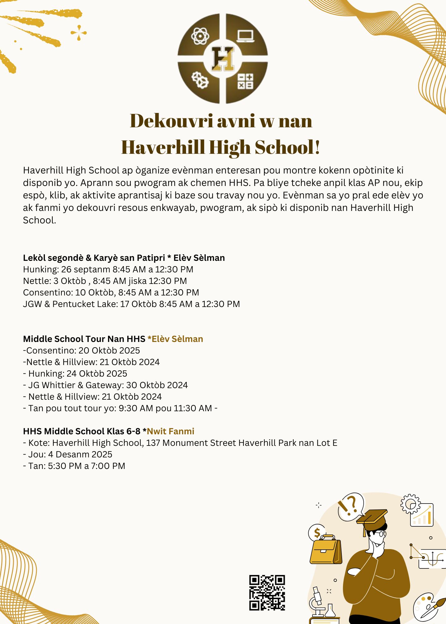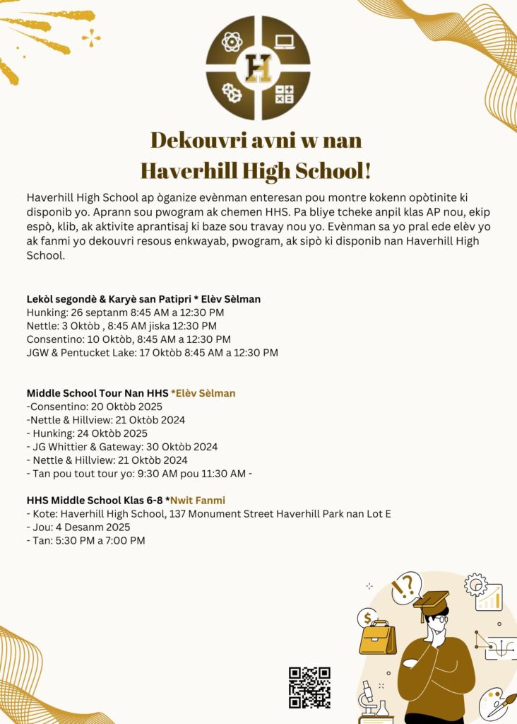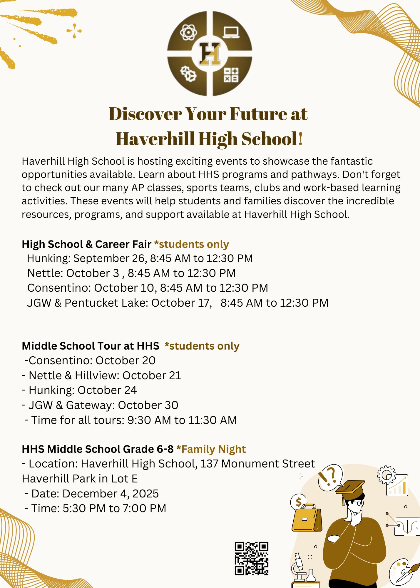 Haverhill High School is hosting exciting events to showcase the fantastic opportunities available. Learn about HHS programs and pathways. Don’t forget to check out our many AP classes, sports teams, clubs and work-based learning activities. These events will help students and families discover the incredible resources, programs, and support available at Haverhill High School.